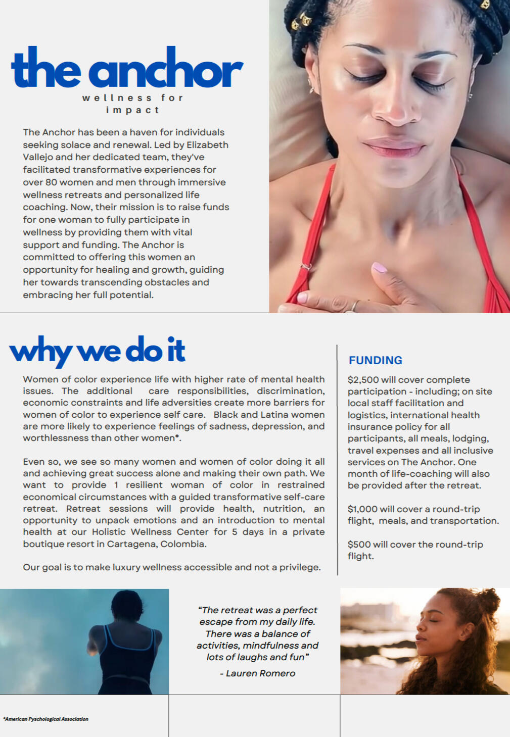 WHAT WE DOThe Anchor is a wellness sanctuary where a spectrum of individuals have found solace and renewal. For the past six years, Elizabeth Vallejo and her dedicated team have facilitated transformative experiences for over 80 women and men. The team offers immersive wellness retreats and personalized life coaching, they've guided people from diverse walks of life toward greater well-being and purpose.WELLNESS AND IMPACTNow, their mission is to fund one deserving woman with the support and funding they deserve in attending one of their retreats. The Anchor and its team are committed to providing this individual with a vital opportunity for healing and growth, supporting them to confront adversities and embrace a once in a lifetime wellness experience.